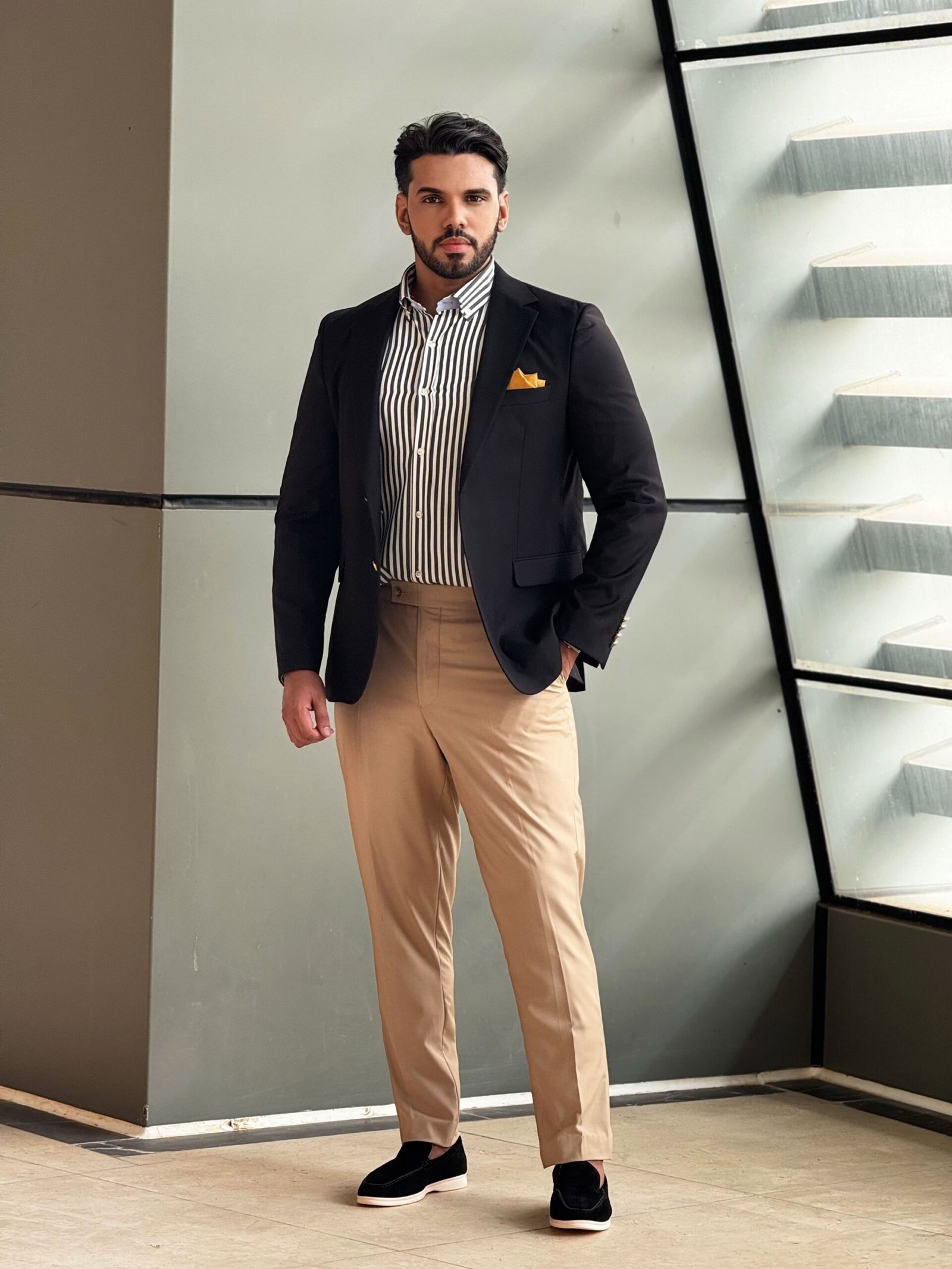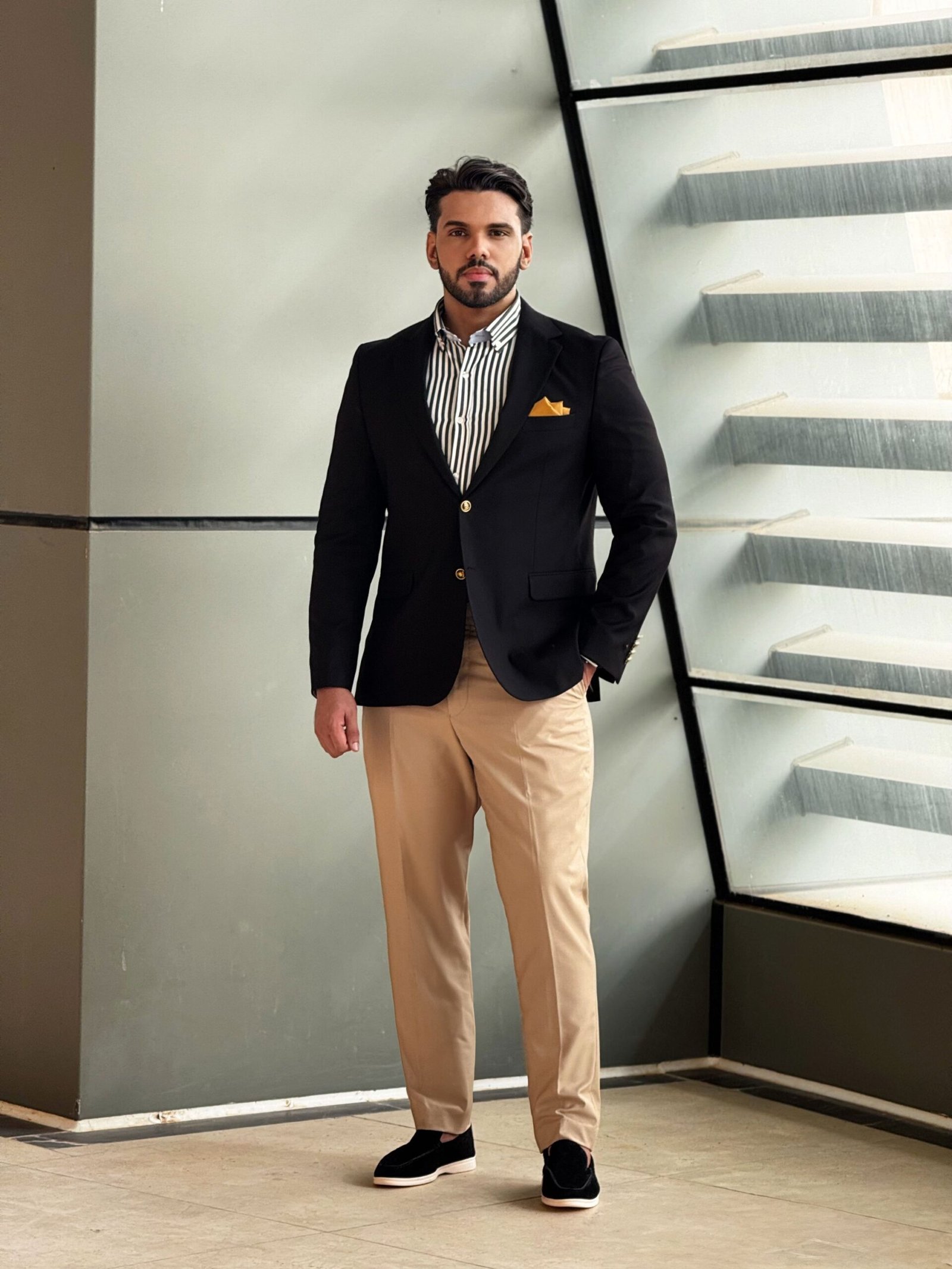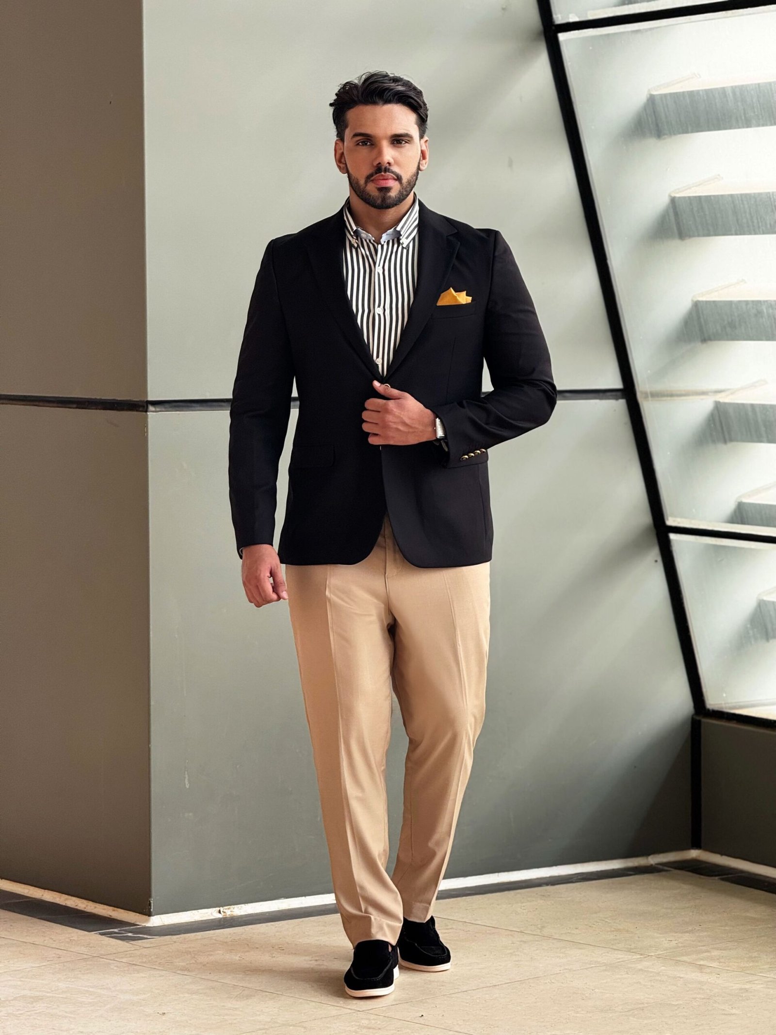 •التفاصيل: أزرار ذهبية أنيقة على الأكمام، وجيب أمامي مزود بمنديل جيب عصري بلون أصفر مميز.