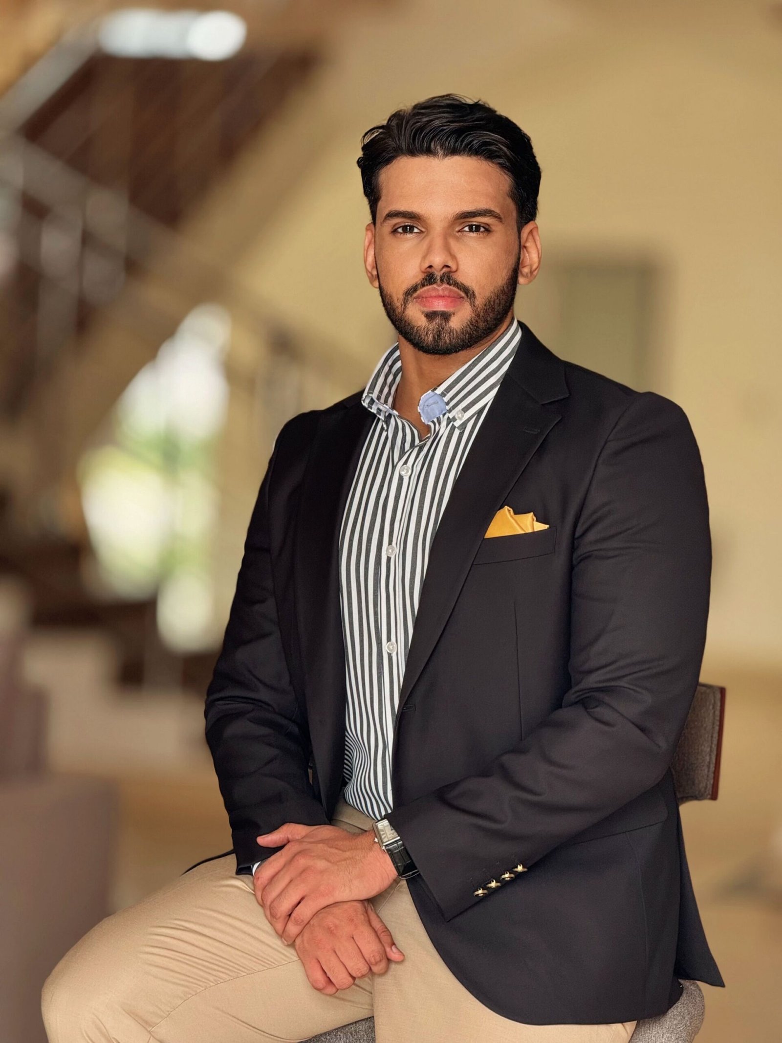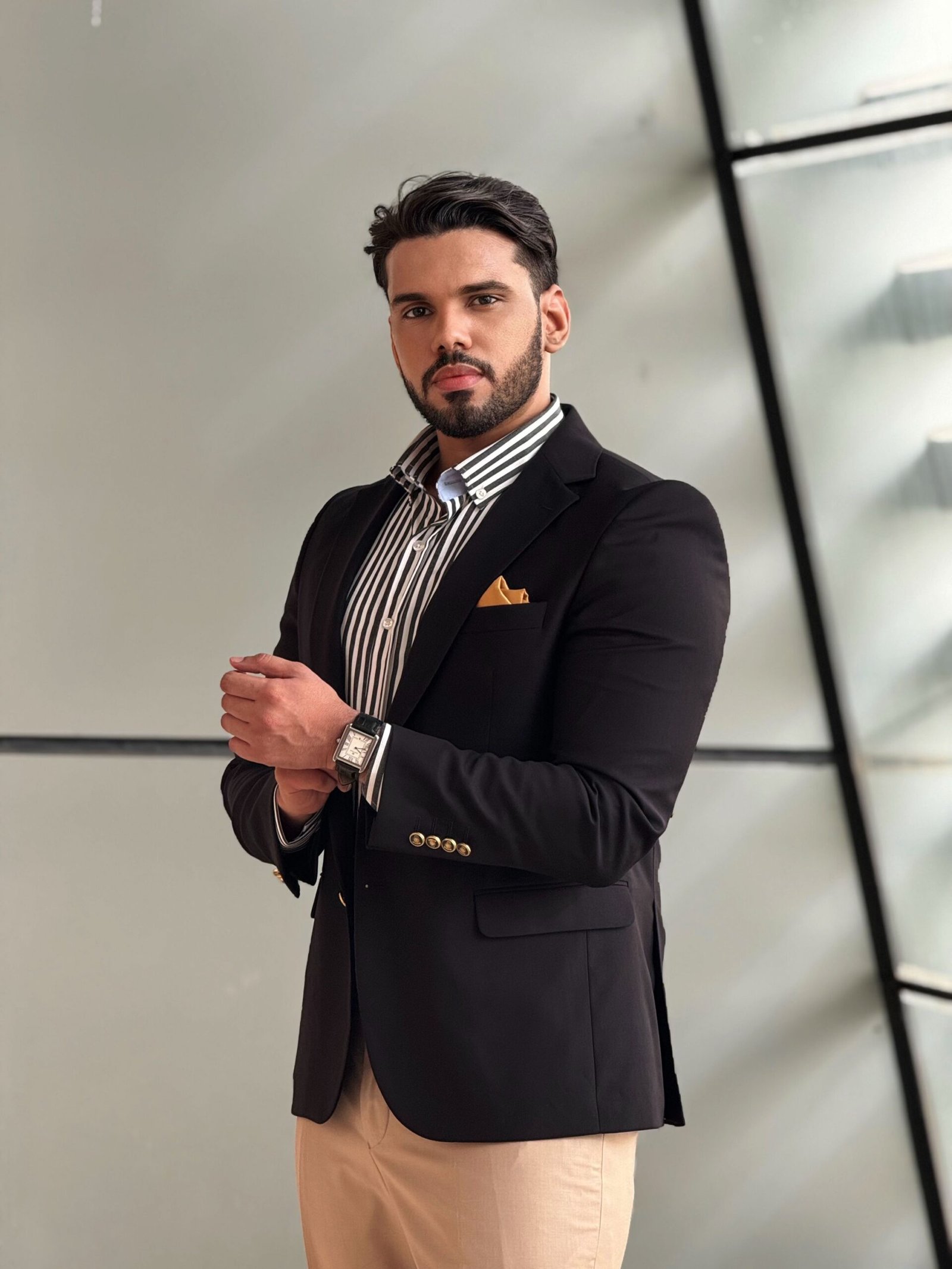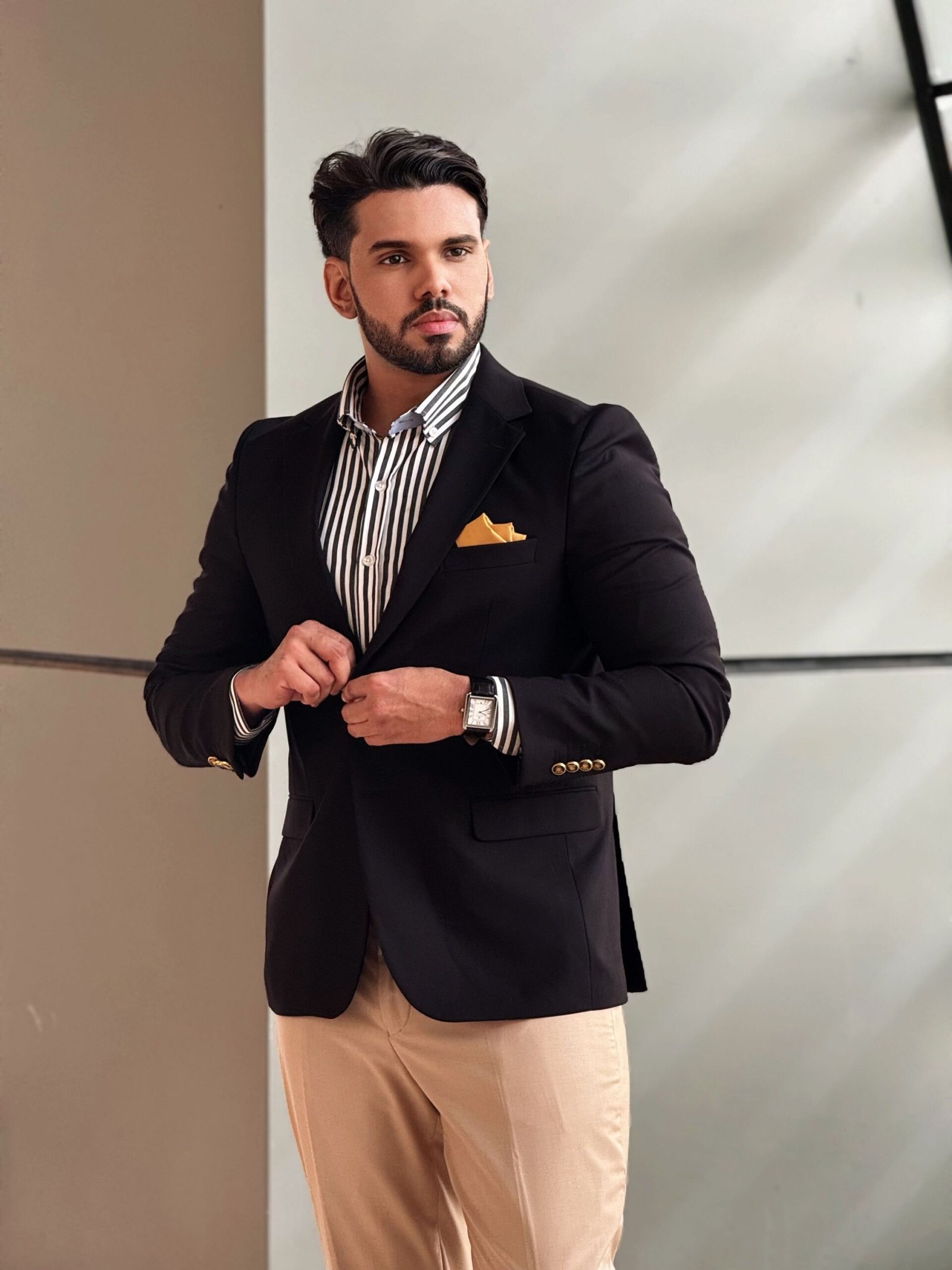 •التفاصيل: أزرار ذهبية أنيقة على الأكمام، وجيب أمامي مزود بمنديل جيب عصري بلون أصفر مميز.