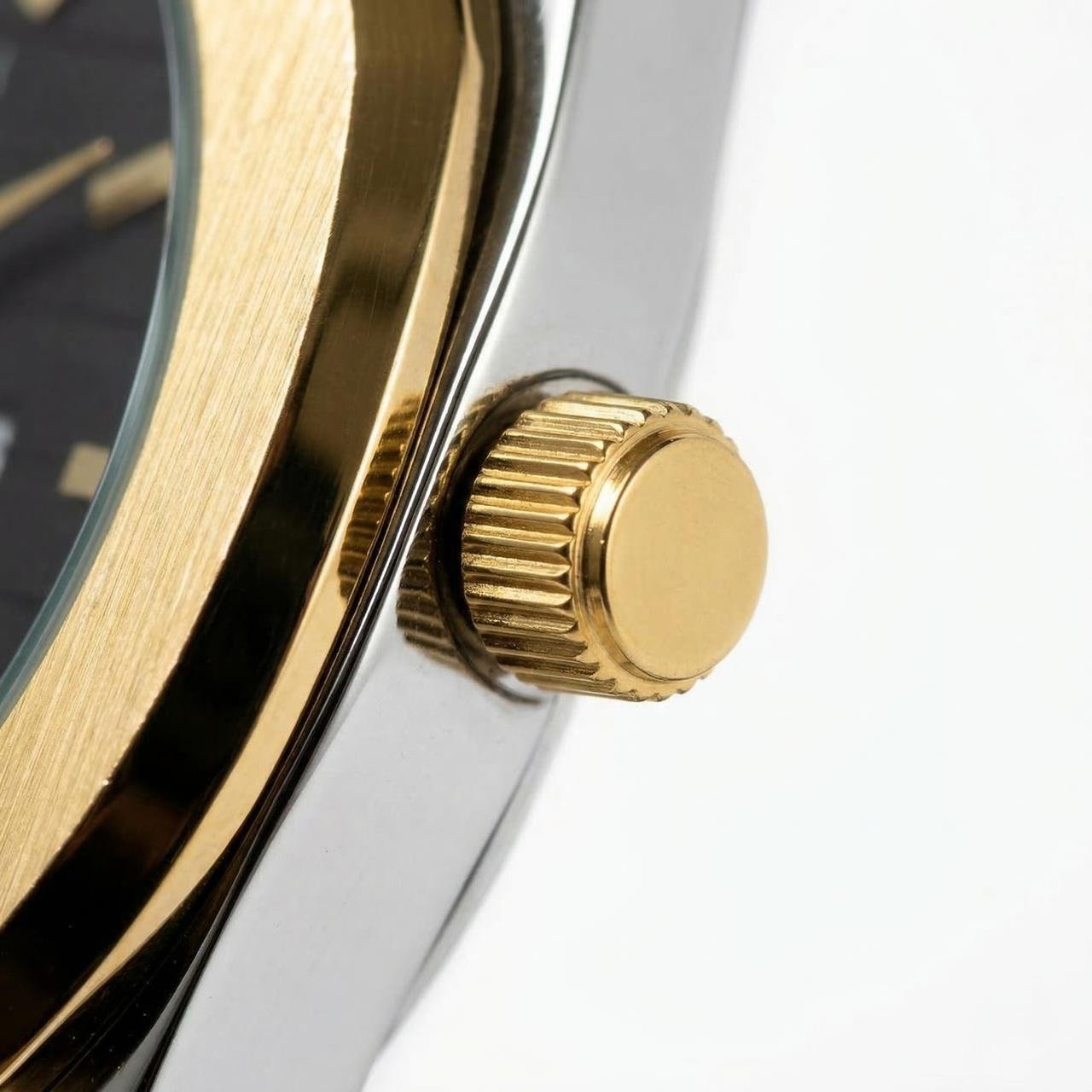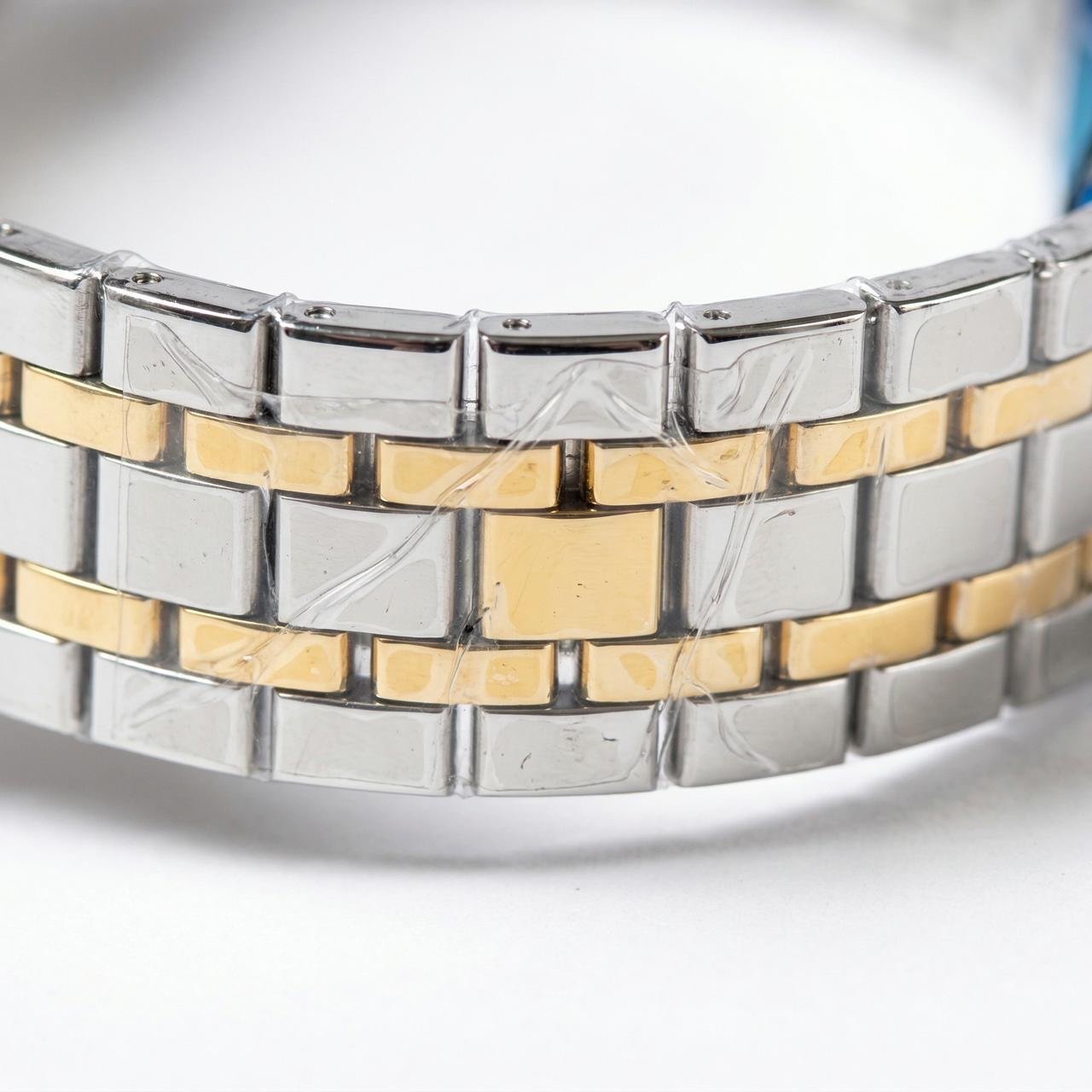 تتميز الساعة بتصميم رجالي أنيق يجمع بين الإطار الذهبي الفاخر والسوار المعدني ثنائي اللون، مما يمنحها مظهرًا راقيًا يناسب العمل والمناسبات والسهرات.