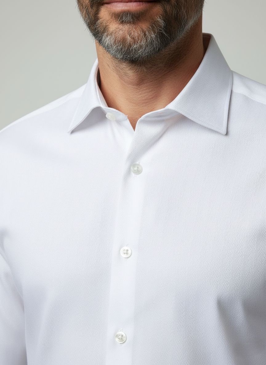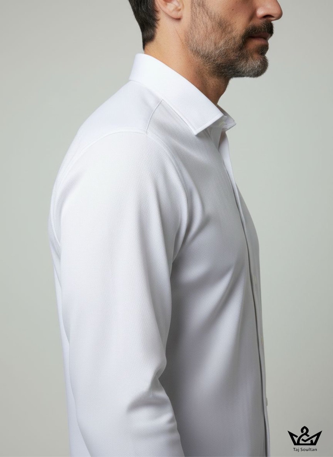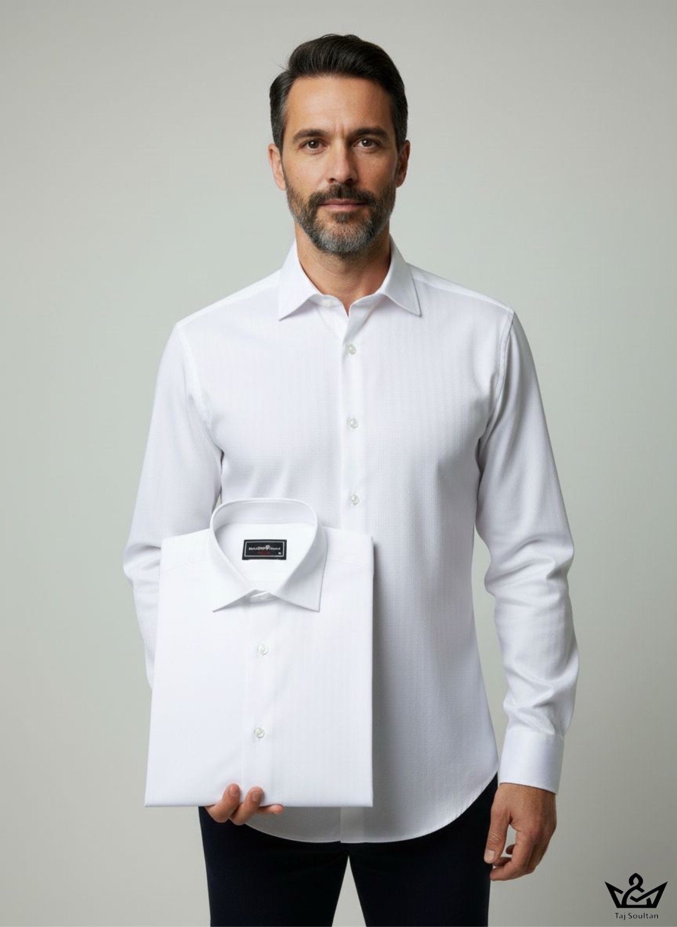 • الخامة: قماش فاخر عالي الجودة بنقشة مميزة (Herringbone) تمنح القميص لمسة فاخرة.