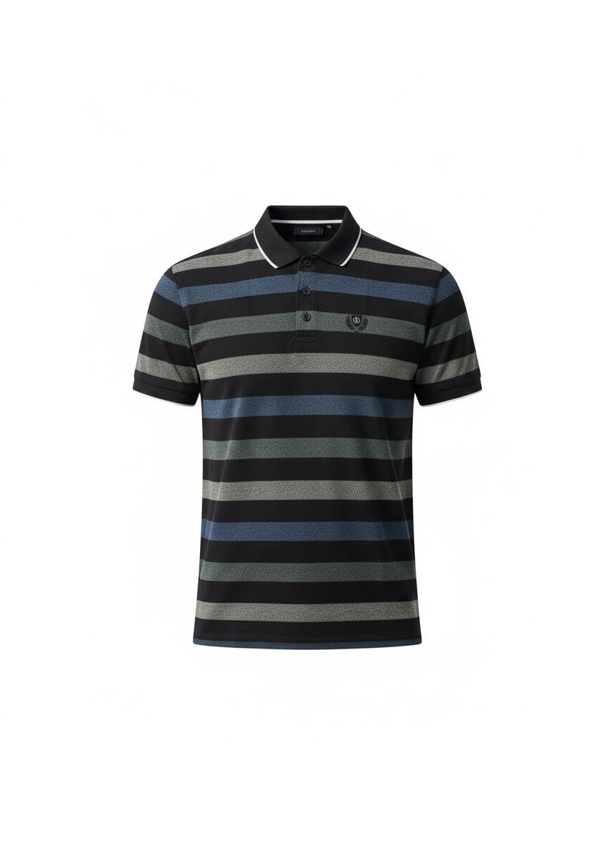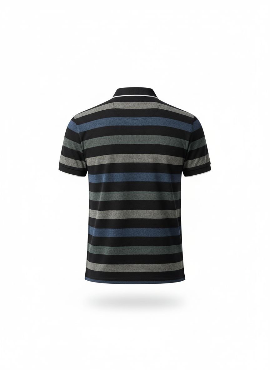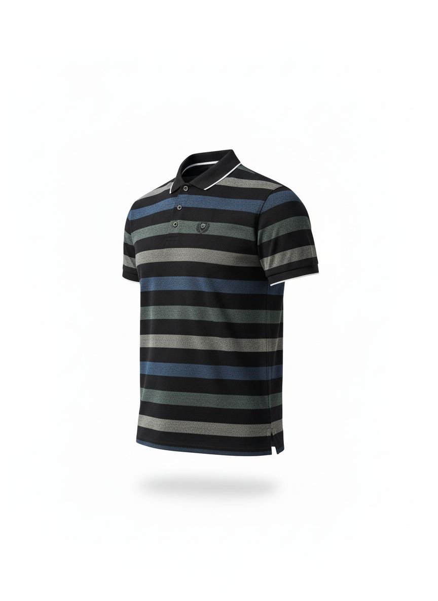 قميص بولو رجالي بخطوط أفقية عصرية يجمع بين الأناقة والراحة. يتميز بتصميم كلاسيكي مزوّد بياقة محاكة بأطراف بيضاء رفيعة وأزرار أمامية لإطلالة أنيقة تناسب مختلف المناسبات.